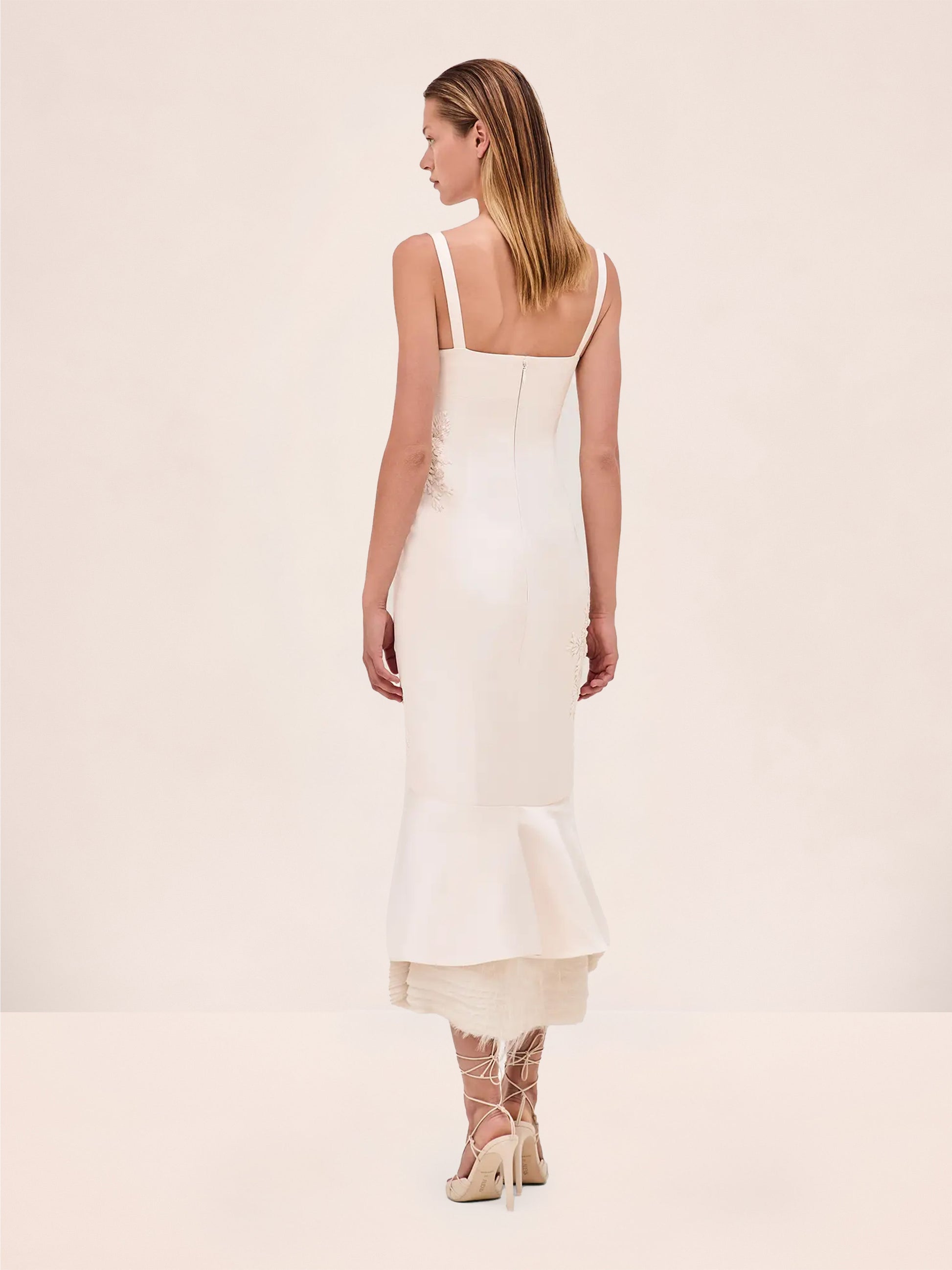The Raquel Dress is a midi design featuring delicate floral embroidery cascading along its fitted silhouette. With double strap detailing and a flared hemline, it flows effortlessly into a layered underlay, adding dimension and elegance.