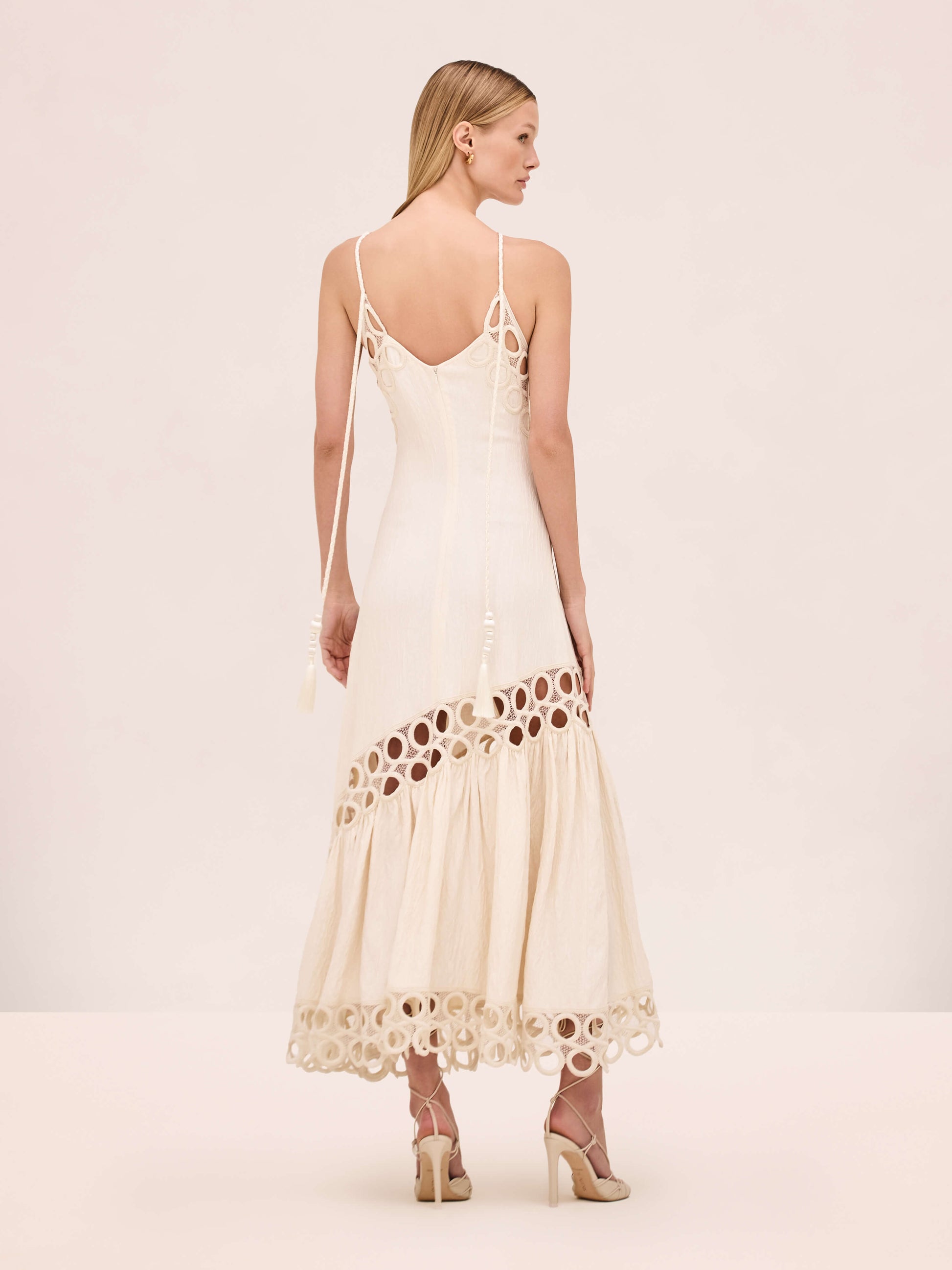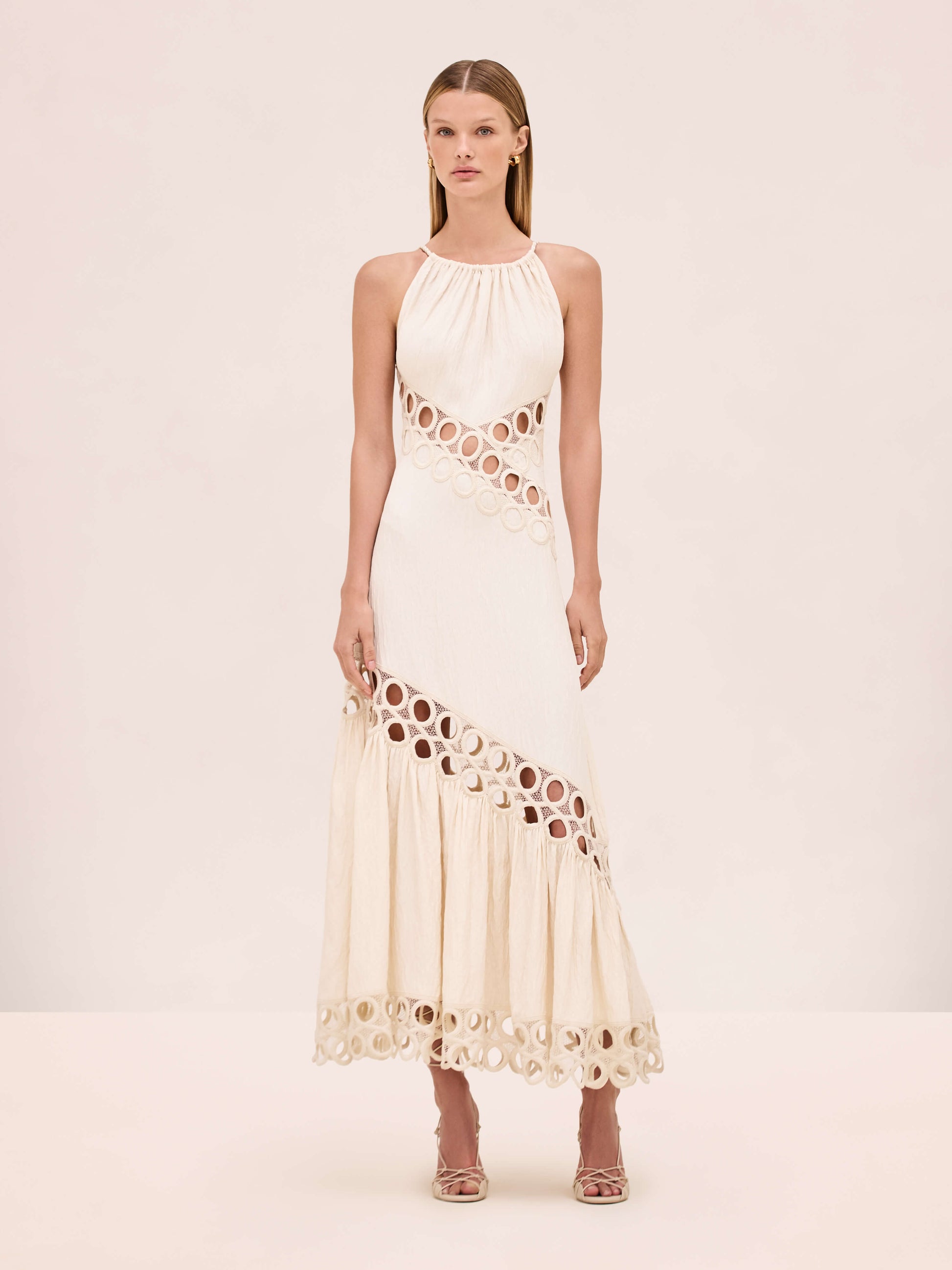 The Chelsea Dress is a halter silhouette featuring circular cutout detailing and a tiered hem.