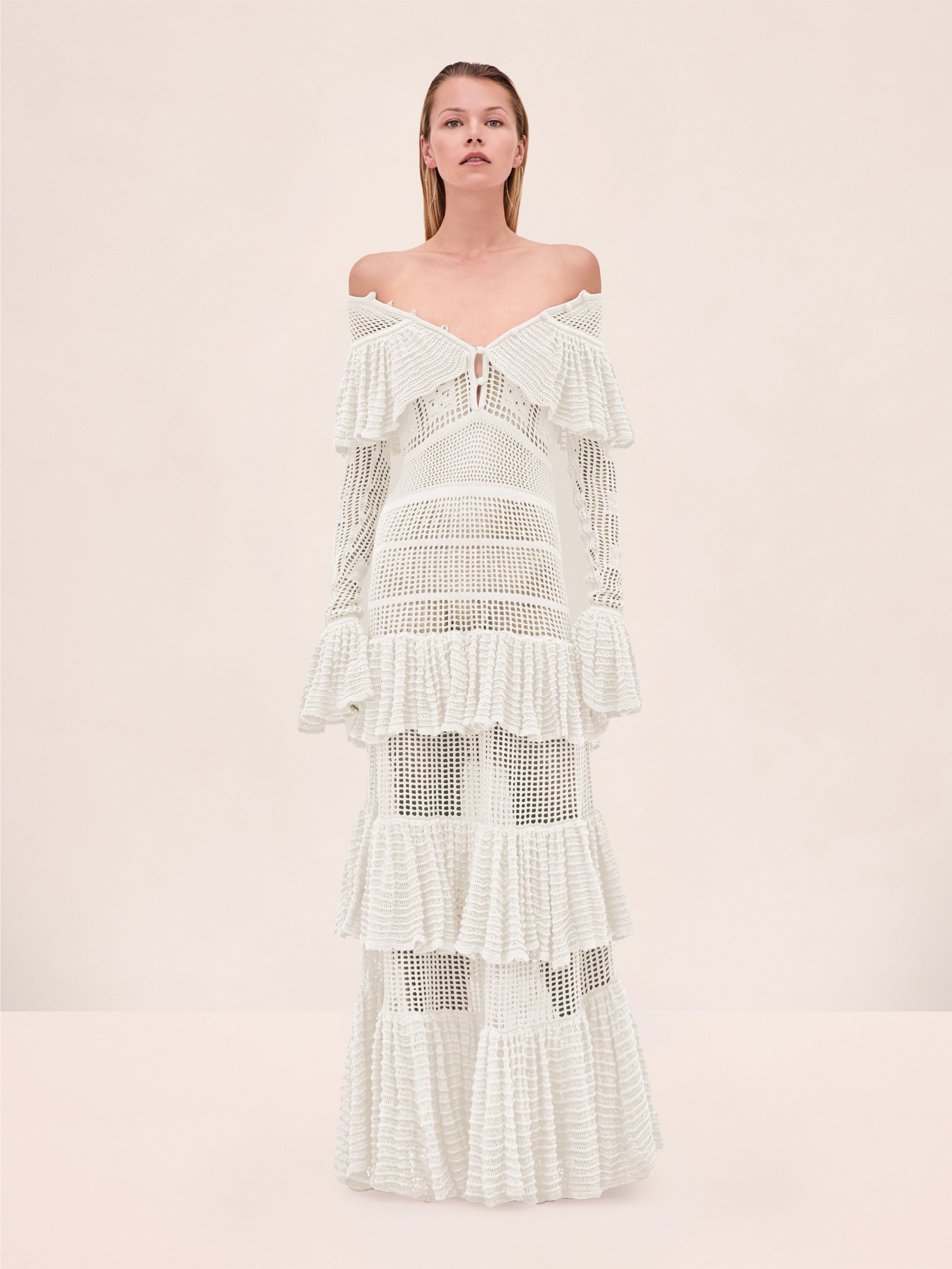 The Carmen Dress is an off-the-shoulder ruffled knit dress designed with intricate openwork detailing and cascading tiered ruffles.