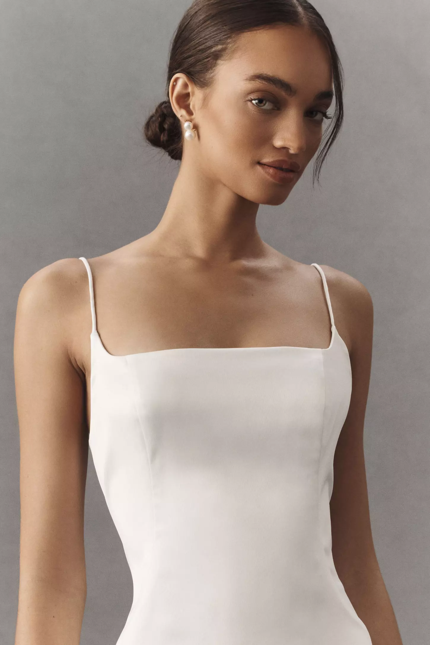 An elegant, sleek fit with a flattering square neckline is perfect for the bride seeking a luxurious, refined look.