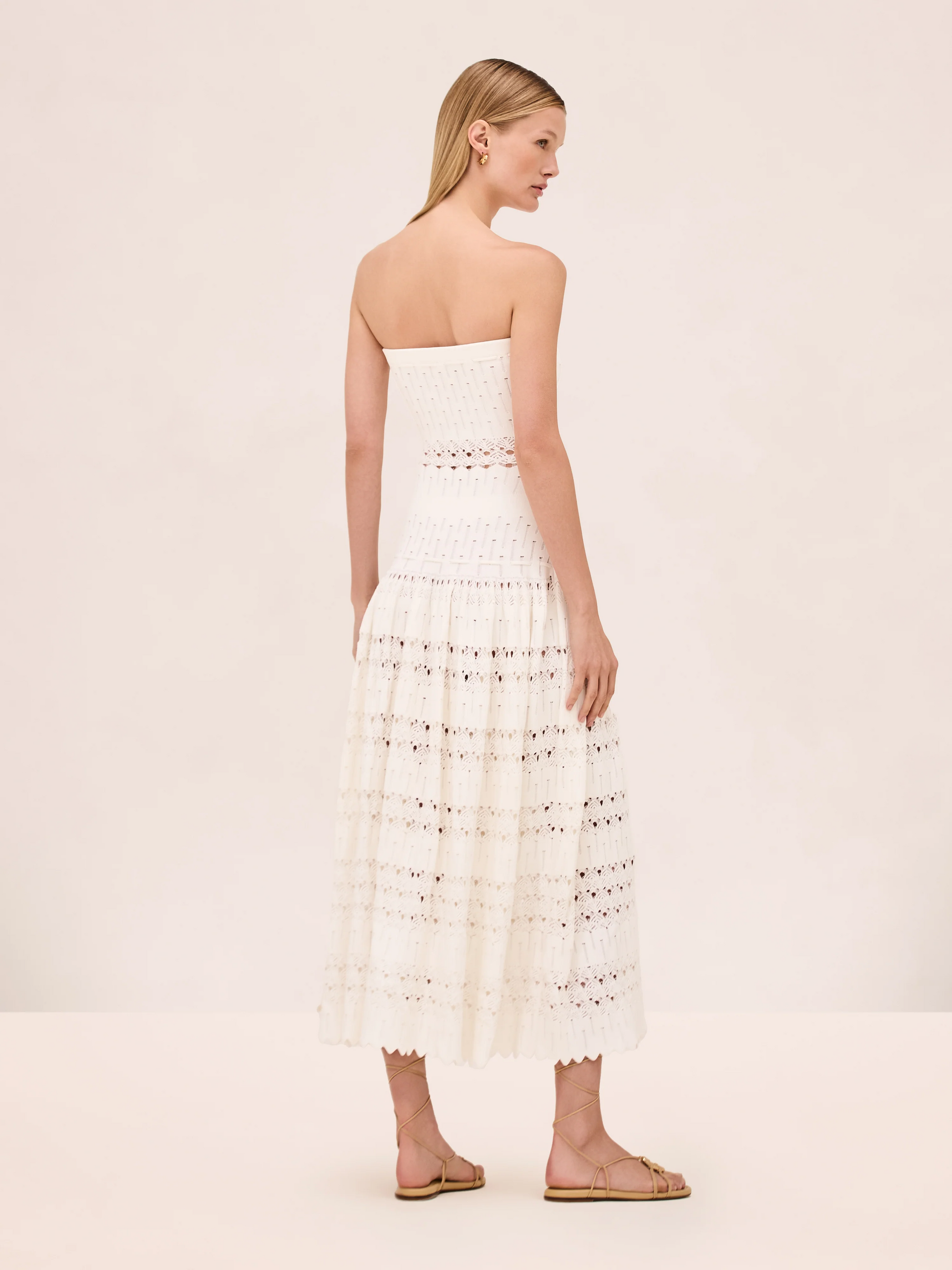The Payge Dress is a strapless silhouette featuring tiered knit eyelet detailing throughout.
